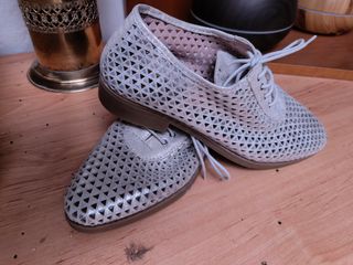 Elegantes zapatos de piel con un diseño calado y detalles plateados. Perfectos para añadir un toque de brillo a tu atuendo, sin dejar de ser un tono discreto. Miden de talón a punta 22.5 cm. Están sin estrenar. - Diseño calado con motivos geométricos. - Cierre de cordones. - Suela cómoda.