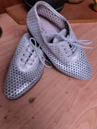 Usados una vez, los zapatos están en muy buen estado. La suela y la tapa del tacón están prácticamente nuevos. La plantilla es de piel. Son cómodos, pero tengo el empeine del pie ancho y me quedan muy justos.