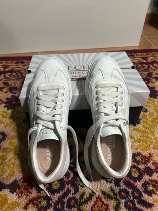 Zapatos Skechers modelo Cordoba con un diseño moderno y cómodo. - Exterior blanco con detalles en rosa. - Suela gruesa de plataforma. - Cierre con cordones.