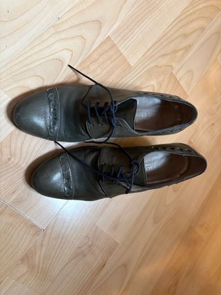 Elegantes zapatos de mujer grises/verdes. Talla 40. - Diseño con cordones y ojales. - Punta fina. - Tacón bajo.