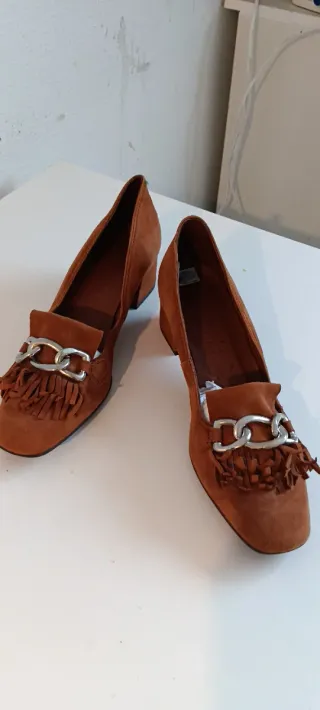 Elegantes zapatos de ante en color marrón, perfectos para añadir un toque de estilo. - Diseño con flecos decorativos. - Detalle de cadena metálica en la pala. - Tacón cuadrado.