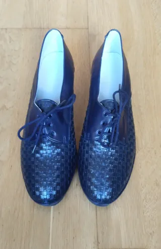 Zapatos mujer. Azul marino. Piel ovina y suela goma. - Diseño con tejido trenzado en la parte delantera. - Cierre de cordones. - Tacón bajo 2 cm. - Fabricado en Inca - Mallorca Nunca usados.
