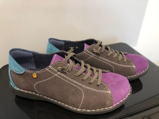 Zapatos cómodos y con un diseño original en 3 colores: malva o lila, marrón y azul. Usados un par de días porque me los compré pequeños. Marca Jungla. Precio original: 79€. Entrego en mano y hago envíos. No contesto regateos, directamente bloqueo. - Combinación de ante marrón y detalles en morado. - Acabado en la parte trasera en azul. - Cierre con cordones.
