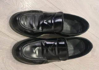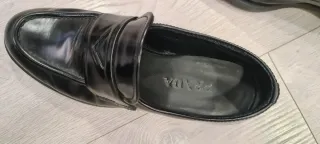 Elegantes zapatos de vestir Prada. - Diseño tipo mocasín. - Acabado brillante. - Detalle de triángulo en la pala.