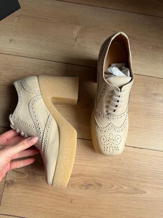 Elegantes zapatos de vestir estilo Oxford en tonos beige y gris. Perfectos para añadir un toque sofisticado a tu atuendo. - Diseño con cordones. - Acabado en ante. - Detalle de picado. - Suela de plataforma.