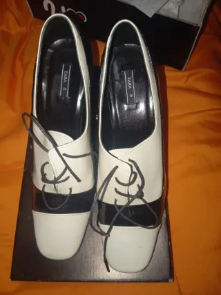 Elegantes zapatos de vestir de Zara con un diseño bicolor. - Combinación de blanco y negro. - Cierre de cordones. - Tacón.
