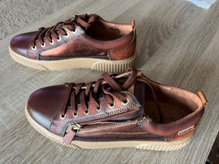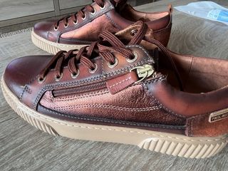 Zapatos de mujer Pikolinos con un diseño moderno y detalles únicos. - Acabado metalizado en tonos marrones y dorados. - Cierre con cordones y cremallera lateral. - Suela de goma con plataforma.