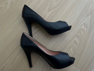 Zapatos de tacón tipo peep toe en charol negro. Zara talla 37. Solo usados media hora. Pequeña plataforma en la parte delantera que los hace muy cómodos. Exteriormente están nuevos. En el interior uno tiene restos de una almohadilla en el talón que puse para que no me quedaran grandes porque no son mi talla. Tiene defectos en el forro de la parte interior de estar en el armario que se ven en las fotos.