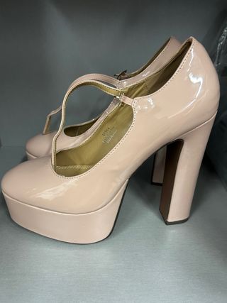 Elegantes zapatos de tacón con plataforma y tira en T. - Color beige y rosa. - Tacón grueso y alto. - Acabado brillante.