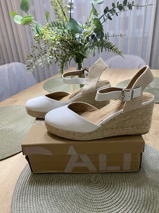 Alpargatas de cuña con detalle de esparto. - Material exterior de piel. - Cierre de pulsera al tobillo. - Suela de esparto. Ideal para eventos (bodas, bautizos, comuniones, cumpleaños...) y días casuales (vaqueros, informal) Muy comodos gracias a su plataforma delantera Altura de cuña 8 cm Altura de plataforma 2,5 cm