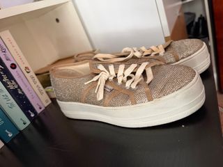 Zapatos de plataforma con un diseño brillante y llamativo. - Acabado con brillos en color dorado y beige. - Cordones de color claro. - Suela de plataforma blanca.