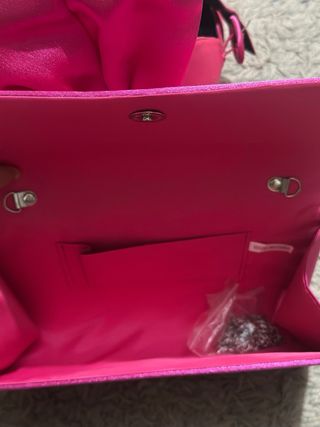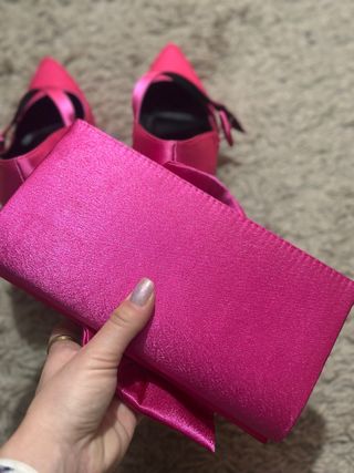 Elegante conjunto de bolso de mano y zapatos de tacón, perfectos para eventos especiales. - Bolso de satén con cierre. - Zapatos de tacón y plataforma acabado en punta - Color fucsia vibrante.