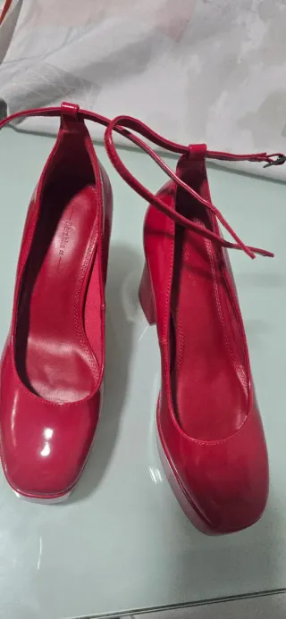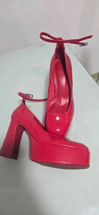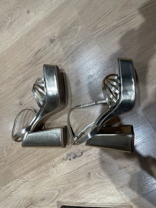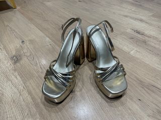 Elegantes zapatos de tacón con plataforma y tira al tobillo. - Tacón grueso y cuadrado. - Diseño abierto en el empeine. - Cierre con hebilla dorada. Un solo uso. Precio original: 115€