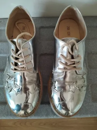 Zapatos planos plateados de Zara con un diseño de estrellas. - Detalle de estrellas aplicadas en la parte delantera y trasera. - Cierre con cordones. - Suela con plataforma.
