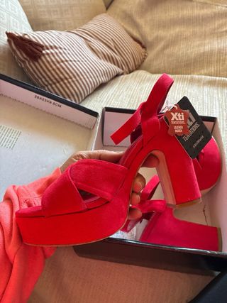 Elegantes zapatos de tacón con plataforma y detalle de lazo. Solo se han usado una vez. - Color rojo vibrante. - Diseño peep toe. - Tacón de altura media.
