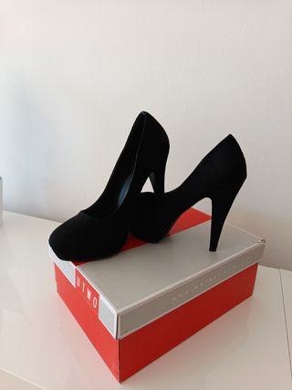 Zapatos de plataforma de ante de la marca "Lefties" en color negro y con tacón cuadrado. N° 37 (aunque dan menos número). Sin caja. En perfecto estado, casi sin uso. Se entregan en Móstoles o envíos.