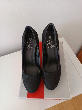 Preciosos zapatos de tacón alto NUEVOS, tipo plataforma. Son de color negro y tienen cremallera lateral. Ideales para cualquier ocasión. No se han utilizado nunca. - Tacón alto y plataforma. - Cremallera lateral. - Diseño elegante.