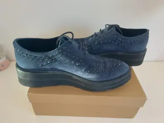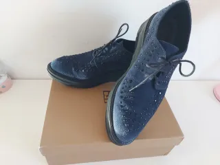 Elegantes zapatos planos de piel.sin estrenar .5cm de tacón y 1 cm de plataforma,se hacen envíos ,más cosas en mi perfil - Color azul. - Marca MARIA JAEN. - Diseño con perforaciones decorativas.