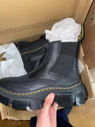Botas estilo Chelsea de Dr. Martens en color negro. Presentan un diseño moderno con suela gruesa y detalles distintivos de la marca. - Cierre de cremallera frontal. - Paneles elásticos laterales. - Costuras amarillas visibles en la suela. - Suela de plataforma gruesa.