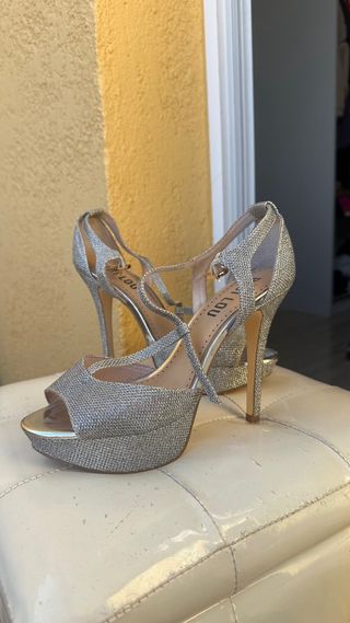 Tacones de fiesta con un diseño muy elegante y brillante. - Acabado plateado con detalles brillantes. - Plataforma delantera. - Tira en el tobillo para mayor sujeción. -Usados una vez.