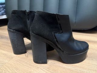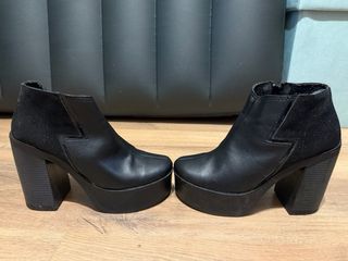 Elegantes zapatos negros con tacón de plataforma. - Tacón grueso y alto. - Diseño tipo botín. - Detalle elástico lateral.