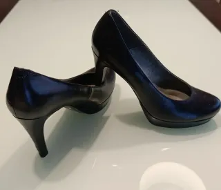 Elegantes zapatos de tacón con plataforma. - Material exterior de piel. - Tacón de 8 cm con 2 cm de plataforma. - Diseño clásico, versátil y elegante. - Como nuevo, solo 2 o 3 puestas.