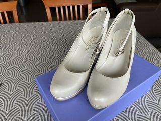 Elegantes zapatos de tacón con un diseño clásico. Con plataformas bajas para que no se siente tanto los tancones altos. Perfecto para novias bajitas. Comodos. - Color blanco perla. - Talla 36. - Detalle de pedrería en la tira. - Material superior de cuero. - Fabricados en España. Llevado solamente en la boda.