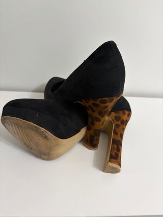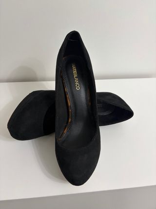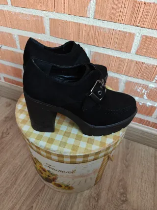 Elegantes zapatos de tacón con acabado en ante y detalles de piel. - Tacón grueso y plataforma. - Diseño de punta redonda. - Sin usar. - Precio original 89€. - Plantilla de gel.
