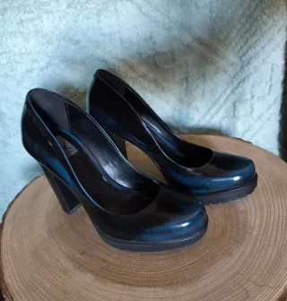 Elegantes zapatos de charol con un diseño moderno y tacón de madera. - Acabado brillante. - Tacón de madera. - Pequeña plataforma