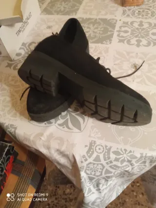 Zapatos de estilo Oxford con cordones y plataforma. - Material exterior de ante. - Suela gruesa y resistente. - Cierre de cordones. Zapatos de mujer tipo Oxford con cordones de la marca Emmshu (vía Ulanka). Exterior e interior de tacto suave, tipo ante/aterciopelado. Talla 38 (tallan pequeño). Suela de plataforma de 4 cm en el talón y 2'4 cm en la parte delantera. A estrenar (lo vendo porque no me va bien la talla). No guardo la caja original.