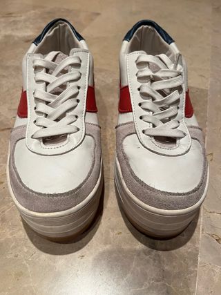 Zapatillas blancas con adornos rojos en los laterales y azules en los talones con gran suela y de cordones. Talla 37.