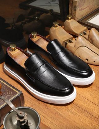 Elegantes zapatos negros de vestir, perfectos para cualquier ocasión formal o casual. - Diseño tipo mocasín. - Suela blanca de goma. - Acabado liso y brillante.