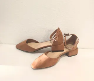 Bonitos zapatos en tono camel, con acabado tipo ante y detalle de tachuelas en la correa del tobillo que les da un toque elegante y moderno. La punta fina estiliza el pie y el tacón ancho bajo los hace muy cómodos para usar durante todo el día. Ideales para combinar con vestidos, vaqueros o looks más formales. Están en muy buen estado, usados pocas veces y sin signos importantes de desgaste. Un modelo versátil, delicado y perfecto para entretiempo.