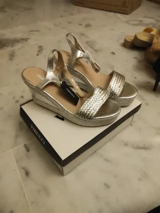 Zapatos plataforma entre tiempo y verano. Tacón de 10 cm. pero muy cómodos por la plataforma. Son de pie de buena calidad de la marca italiana Lara Manni.Suela goma. Tengo caja original. Hechos en Italia. NO HAGO ENVÍOS CON CORREOS