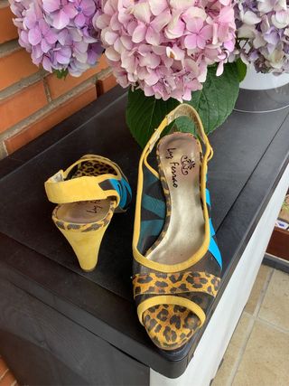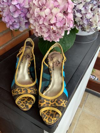 Zapatos de tacón de 9 cm número 40, abiertos por delante y por detrás en tonos amarillos turquesa y marrón. se han puesto tres veces,precio en tienda de 1500 €