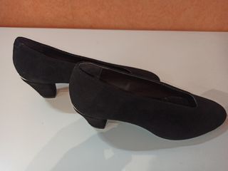 Preciosos zapatos de vestir de la marca Sfera. Son de color negro y tienen un tacón bajo cómodo y elegante. - Material: ante - Tacón bloque - Talla: (A determinar según la foto) - Se venden 2 zapatos.