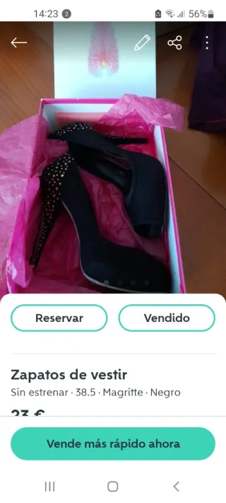Zapato de vestir negro , talla un número 34 , abierto por delante y de unos seis centímetros de altura , solo se usaron una vez y no más de una hora .