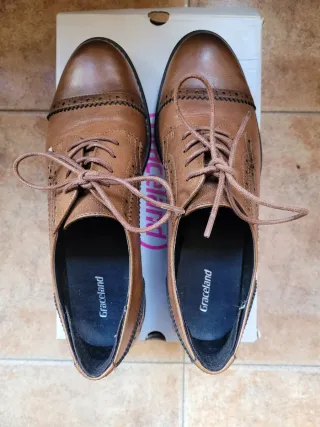 Elegantes zapatos de vestir con un diseño clásico y detalles perforados. - Acabado brillante. - Cordones marrones. - Suela gruesa Los agujeritos no calan O sea, no entra el agua, solo estan por encima.