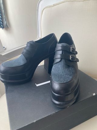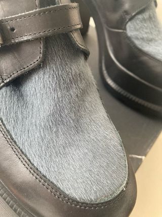 Elegantes zapatos italianos con un diseño único. - Tacón grueso y plataforma. - Cierre con doble hebilla. - Detalle de pelo en la puntera.