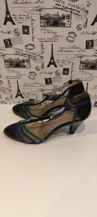 Elegantes zapatos de salón con un diseño de tiras en contraste. - Tiras en color azul y verde. - Tacón curvo.