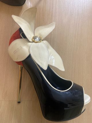 Elegantes zapatos de tacón alto con un diseño llamativo. Zapatillas de piel de fabricación italiana Altura del tacón 15 cm - Acabado brillante en negro. - Detalle de flor en la parte superior. - Tacón dorado fino. - Plataforma delantera.
