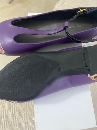 Elegante Zapato de Tango de la marca Italiana Bandolera modelo A12 Pitoncino Lux Electrum Fabricado en Italia con cueros Italiano de gran calidad de colores azul electrónico, morado y estampado. Suela de cuero genuino(Vero Cuoio). Talla 38. Muy almohadillado en la zona del metatarso, tecnología patentada NO MORE PAIN Precioso tacón de 9cm pintado a mano . Las 3 primeras fotos son de la web del fabricante, las otras son las fotos reales del zapato. Se entrega en la caja original del producto. Se ha usado solo pocas ocasiones . Gran oportunidad. Producto de marca de gran calidad y comodidad. Costó 160€