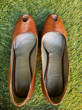 Elegantes zapatos de piel para mujer. - Material: Piel - Color: Marrón - Diseño: Punta cuadrada con pespuntes - Tacón: Bajo - TODO PIEL INCLUIDO INTERIOR Y SUELA DE CUERO - USADOS UN PAR DE VECES