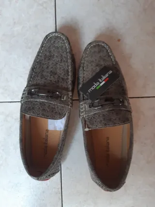 Elegantes mocasines de la marca Moda Italiana. - Diseño moderno en tono gris plateado. - Detalle metálico en la pala. - Acabado texturizado.