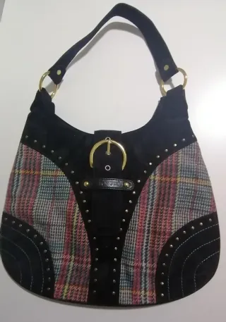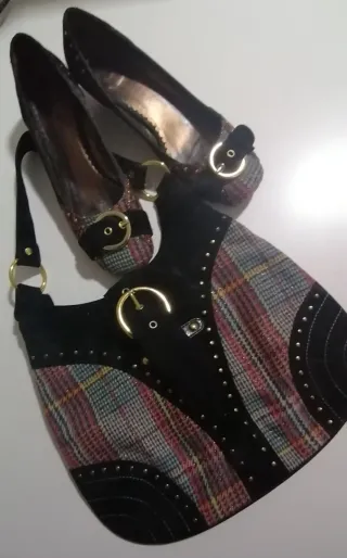 Conjunto de bolso y zapatos de diseño italiano. - Bolso con detalles de tachuelas doradas. - Zapatos con hebilla dorada. - Tejido a cuadros con hilo brillante.