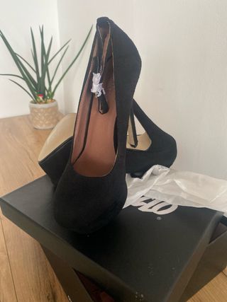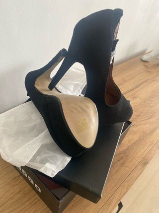 Elegantes zapatos de tacón de piel en color negro. Se encuentran en buen estado. - Material: Piel - Color: Negro - Combinación de dos texturas. - Llevan un poco de plataforma para poder llevar mucho tacón de forma cómoda. -Altura tacón: 10,5 cm con plataforma de 1,5 cm.