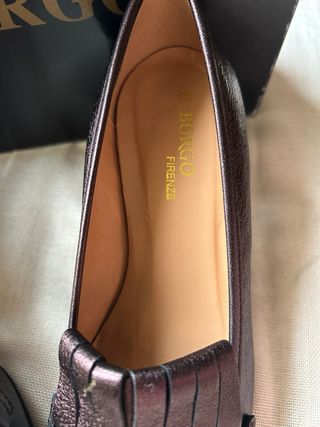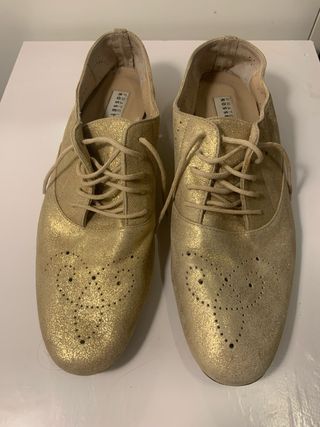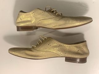Vendo estos exclusivos derbies de mujer, fabricados íntegramente en piel muy suave, con delicados detalles perforados. Marca italiana Fratelli Rossetti. - Color dorado brillante. - Talla 38. - Están en excelente estado, solo con ligeros signos de uso en la suela, tal como se aprecia en las fotos.
