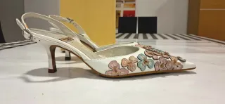 Elegantes zapatos de fiesta de la marca Gino Vaello. - Diseño italiano. - Adornados con flores en tonos pastel. - Tira ajustable al tobillo. - Piel natural - Nunca se han usado