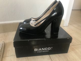 zapato de piel y suela flexible de goma, de marca italiana. elegantes y comodos zapatos de salon color negro. estrenados dentro de una oficina solo un dia. me apretan, pero quedan preciosos. el cuero brilla y llaman la atencion. si buscas un zapato comodo y de vestir, este el zapato perfecto. son hechos en Italia. Me los compre para una cita importante en la oficina y al cabo de la jormada note que me iban pequeños. Si quedamos, te los puedes probar sin compromiso.