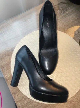 Zapatos de tacón del número 37 de piel. El tacón mide unos 10,5 cm de alto por la parte más alta y tienen una plataforma interior de 1,5cm que los hace cómodos de llevar.